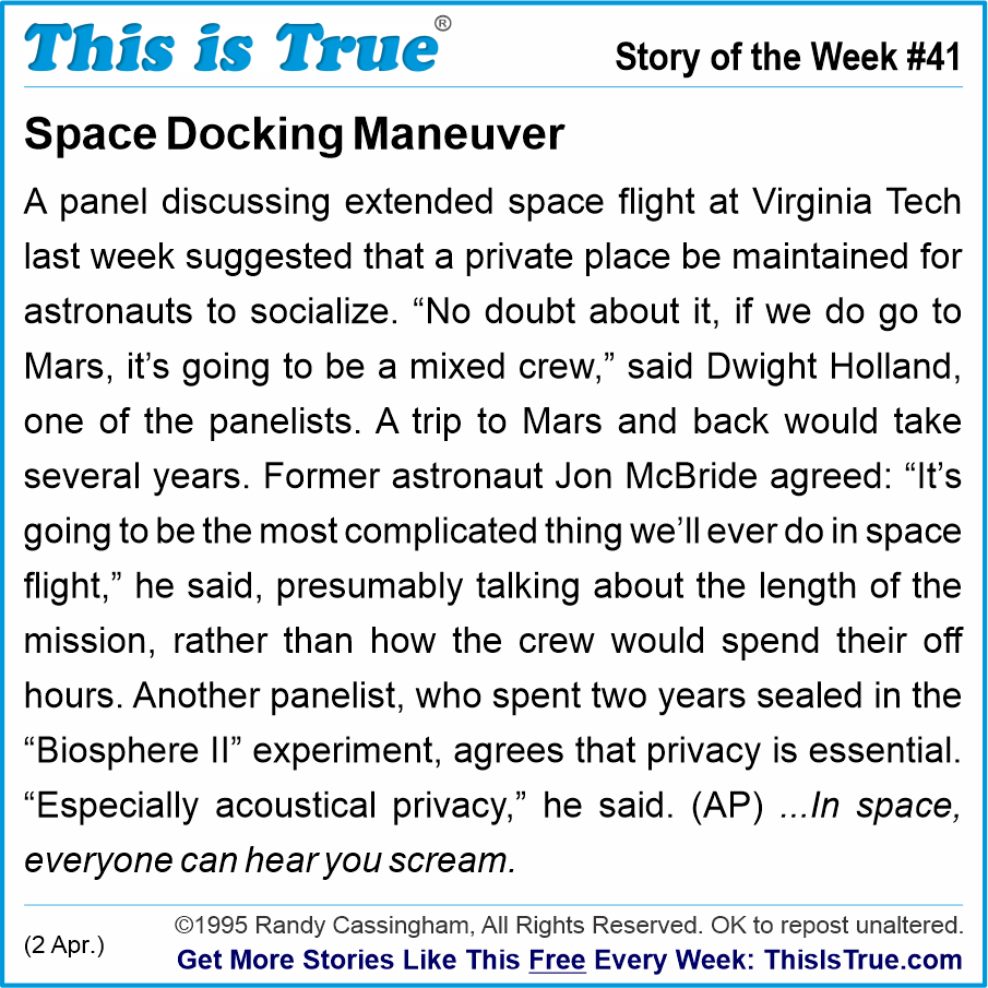 On the other hand, the Hollywood Reporter says the line “popped into her head while she was washing dishes, and all the other words that had been previously considered for the poster were summarily discarded.” Either way, “The line has become so famous that it is often quoted independently of the film itself,” MovieWeb says, “and you would be hard pushed to find someone that hasn’t ever heard of it. It encapsulates the essence of the story and serves as a chilling reminder of the vastness of space, evoking a sense of dread in the audience.” Besides being a popular meme, the tagline “played a significant role in securing Alien’s status as a cultural phenomenon.” One of the turns of the phrase was the tagline a very early This is True story — Issue 41 (see graphic). Philip died in 2019, at 88. Barbara died in a Bronx hospital on October 16 after suffering a stroke. She was 89.
